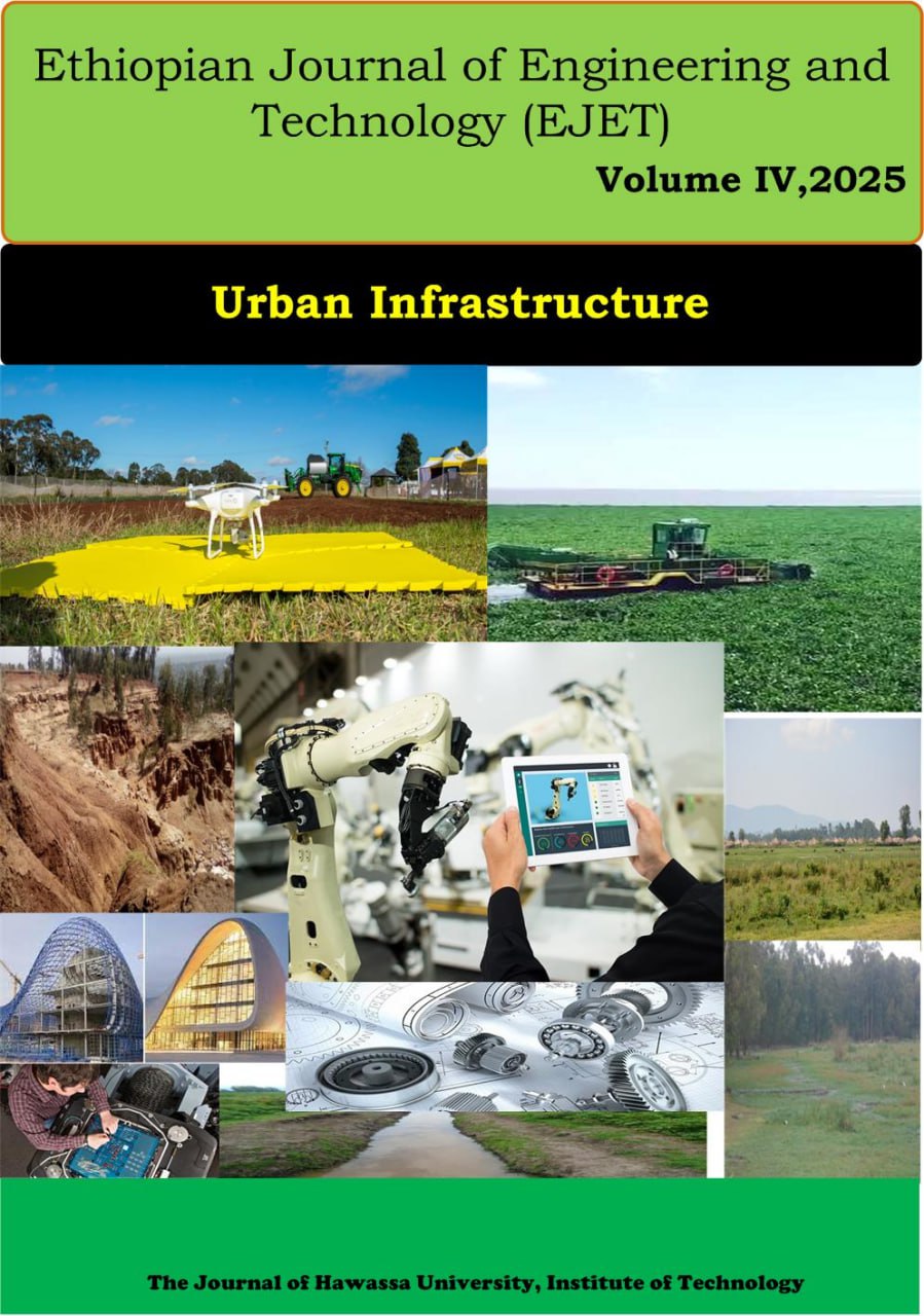 Vol. 4 No. 2 (2025)The current issue addresses a diverse range of topics relevant to urban infrastructure in both global and Ethiopian contexts. It includes the investigation of machine learning models for foodborne disease classification, shedding light on health and safety within urban environments. Business failure and the organizational capacity of contractors in Ethiopia are explored, highlighting the critical role of institutional strength in infrastructure development. A GIS-based analysis of land use and land cover change dynamics in the Boricha Catchment of the Central Main Rift Valley Lakes Basin of Ethiopia provides insights into environmental management and urban expansion. The effects of green supply chain practices on the environmental sustainability of Ethiopian small and medium-scale garment manufacturers are examined, connecting industrial growth with ecological responsibility. Further, the issue discusses Building Information Modeling (BIM) education and training in Ethiopia, emphasizing its significance in modern construction practices. "The Urban Paradox: Navigating Social Challenges and Building Resilience in the Heart of Cities" offers a deep dive into the socio-economic dynamics in selected cities of the Southern Corridors of Ethiopia. Conservation and restoration practices for historical buildings in Arada Sub-City, Addis Ababa, are investigated, demonstrating the importance of cultural heritage in urban planning. The stress analysis and optimization of critical components in plunger pumps illustrate advancements in mechanical systems vital to urban services. Finally, the issue presents perceptions of households towards urban waste management challenges, drawing evidence from the Southern Ethiopia Urban Corridor, and underscoring the role of public engagement in sustainable urban living.